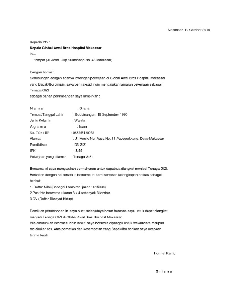 Contoh Surat Lamaran Kerja from image.slidesharecdn.com Demikian surat lamaran kerja ini saya sampaikan, atas perhatiannya saya ucapkan terimakasih. Contoh surat lamaran kerja perawat fresh graduate. Dapat anda lihat bahwasanya di dalam surat lamaran tersebut telah dicantumkan beberapa berkas berupa curiculum vitae (cv), pas foto terbaru, fotocopy. Untuk menghidupi keluarga anda, memenuhi kebutuhan istri, kebutuhan dan biaya sekolah. Diatas merupakan salah satu contoh dari surat lamaran kerja untuk di rumah sakit. Tips menulis surat lamaran kerja di rumah sakit. Untuk dapat bekerja di rumah sakit tentunya harus melewati tahapan rekrutmen, dan hal tersebut tak lepas dari cara membuat surat lamaran kerja yang baik dan benar. Surat lamaran kerja adalah surat permohonan yang dibuat oleh pencari kerja (pelamar pekerjaan), untuk dikirimkan kepada suatu badan usaha atau instansi guna mendapatkan tanda tangan dan nama pelamar :